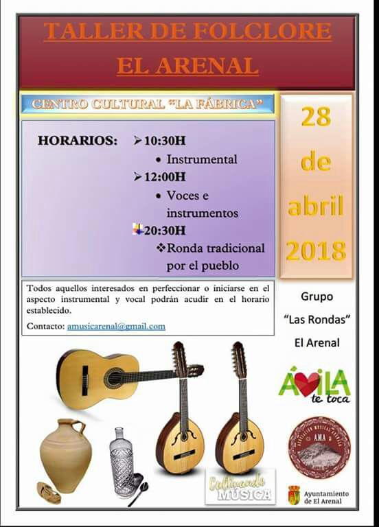El próximo día 28 de Abril de 2018 se celebrara en el Centro Cultural La Fabrica un taller de música folclórica de nuestra localidad. Se trata de un taller organizado por la Asociación Musical Arenala en cooperación con el grupo Las Rondas de El Arenal.
