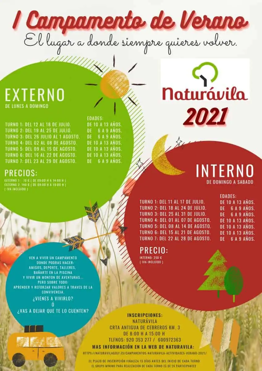 Nuestra larga experiencia en la organización de programas de ocio para niños y jóvenes, nos permite frecer a todos ellos, la más variada oferta existente en el mercado, garantizando la seguridad y onfianza que los padres necesitan. Con el I CAMPAMENTO DE VERANO – NATURAVILA 2021” queremos ofrecer a los niños una interesante y atractiva opción de actividad estival; que les permita aprender jugando y conviviendo con los demás, todo ello en un entorno cercano, que les permitirá descubrir a través del deporte y la naturaleza las mejores fuentes de ocio.